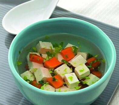 2.將豆腐切小丁,加入做法1的碎胡蘿卜,煮滾成湯。